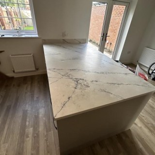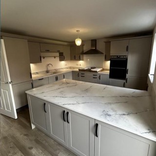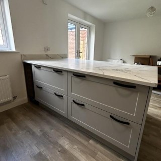 We had the pleasure of designing and installing this fabulous island for our client's. We removed the old worktops and upstands and arranged for their chosen 30mm Santorini Silk Quartz worktops with matching upstands to be fitted. We fitted their new sink and hob and installed a socket above the island. What a stunning transformation and storage galore!